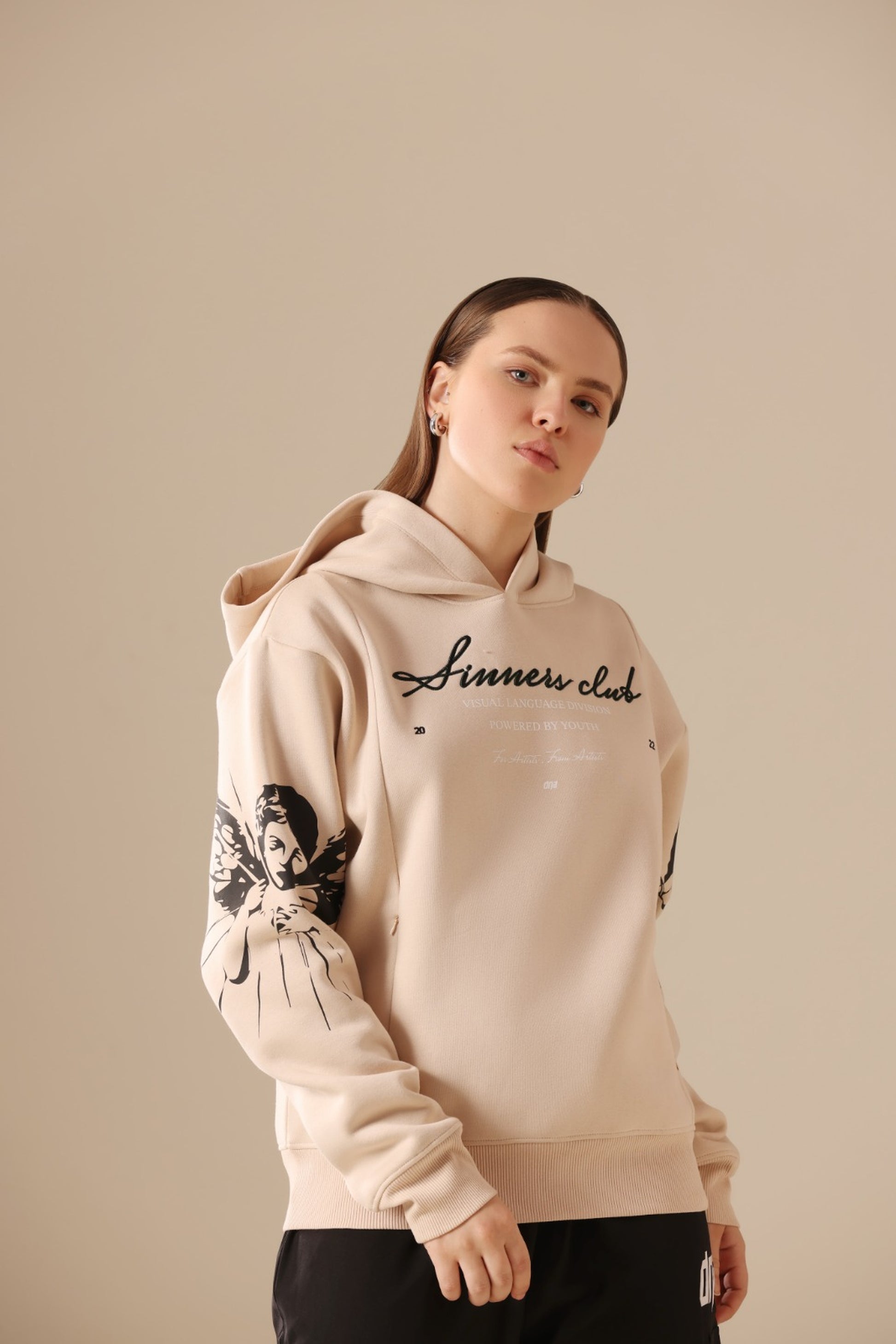 This fawn-colored masterpiece is more than just a hoodie—it's a statement. Featuring a harmonious devil and angel print on each sleeve, it symbolizes the duality within us all.